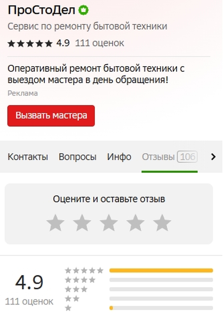 - Оценка 4.9 баллов по общим результатам отзывов в Яндекс Бизнес;
