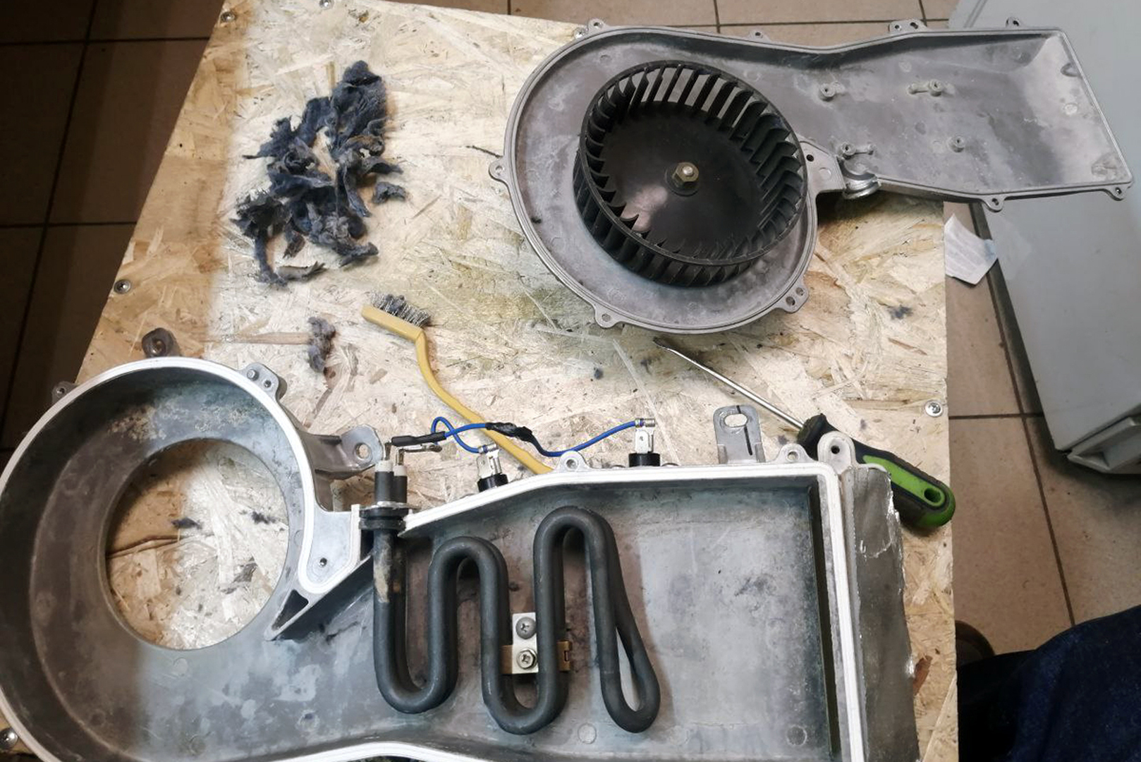После разборки сушильного узла наш мастер обнаружил типичную картину, характерную для стиральных машин с сушкой при нерегулярном обслуживании. Элементы вентиляции и сам сушильный агрегат оказались забиты ворсом. Мелкие волокна ткани со временем накапливаются внутри системы и мешают нормальной циркуляции воздуха, что напрямую влияет на эффективность сушки и безопасность работы техники.